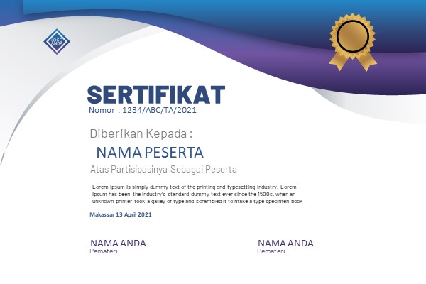 Sertifikat yang Kami desain bisa Anda gunakan untuk acara offline maupun acara online, seperti seminar, workshop, simposium, webinar, kelas online, dll.