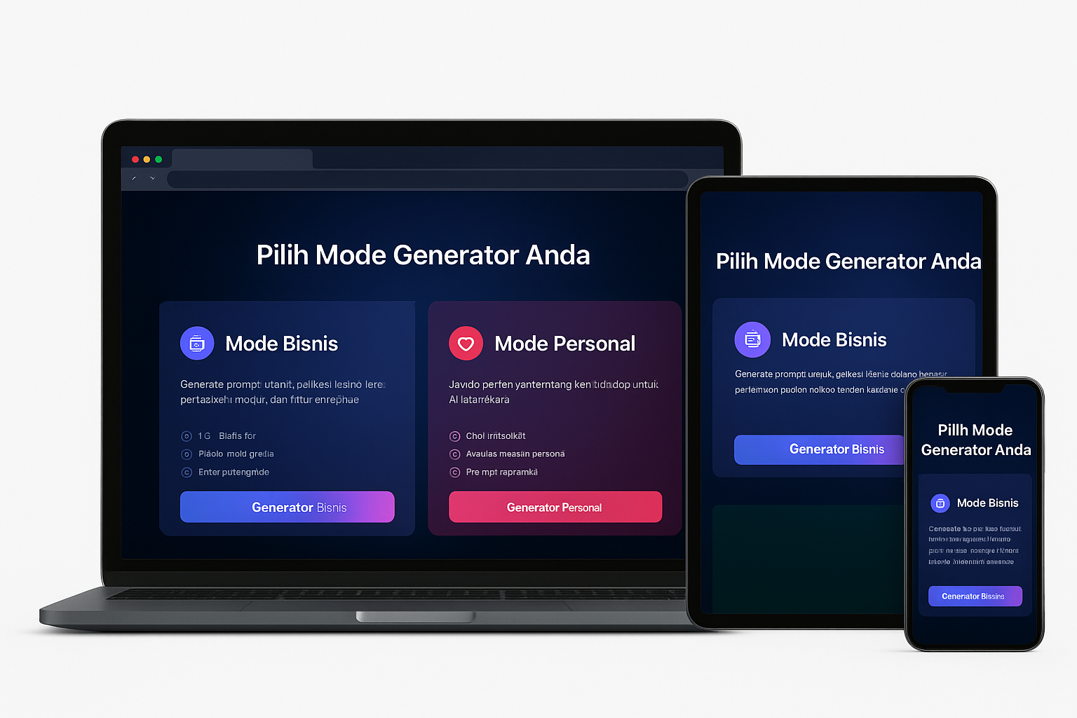 PromptGen adalah alat berbasis AI yang membantu Anda membuat prompt aplikasi bisnis maupun aplikasi personal dalam hitungan detik. Tidak perlu memikirkan struktur, modul, atau alur aplikasi. Semuanya sudah disiapkan secara otomatis. Anda hanya perlu menjawab beberapa hal sederhana, dan PromptGen akan menyusun prompt lengkap, rapi, dan siap digunakan di platform AI seperti ChatGPT, Claude, atau Gemini.